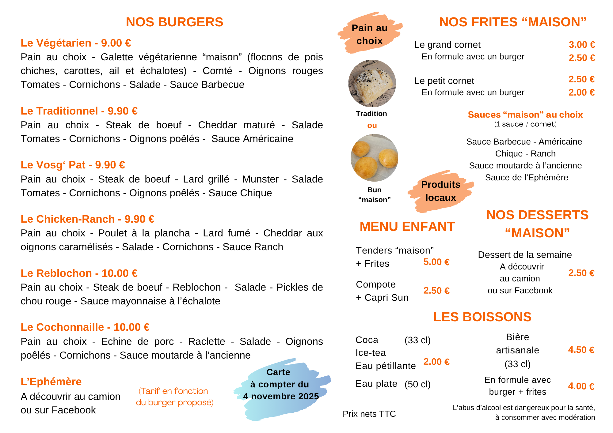 Découvrez notre carte des burgers, notre burger Ephémère (qui change régulièrement) et les différents emplacements de nos deux camions.